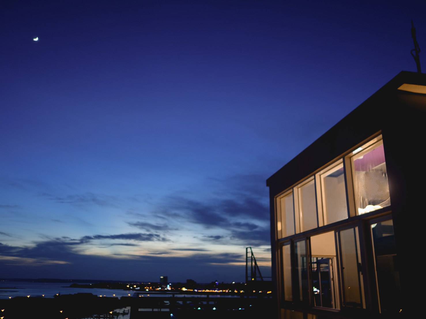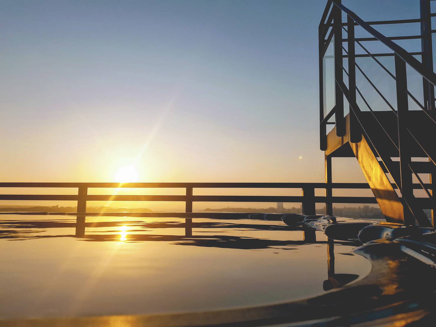 夕陽西下,斜照在清澈的海面,在整片星空夜景下,泡著溫水SPA,遠眺港口海景、漁船燈火及燦爛煙花