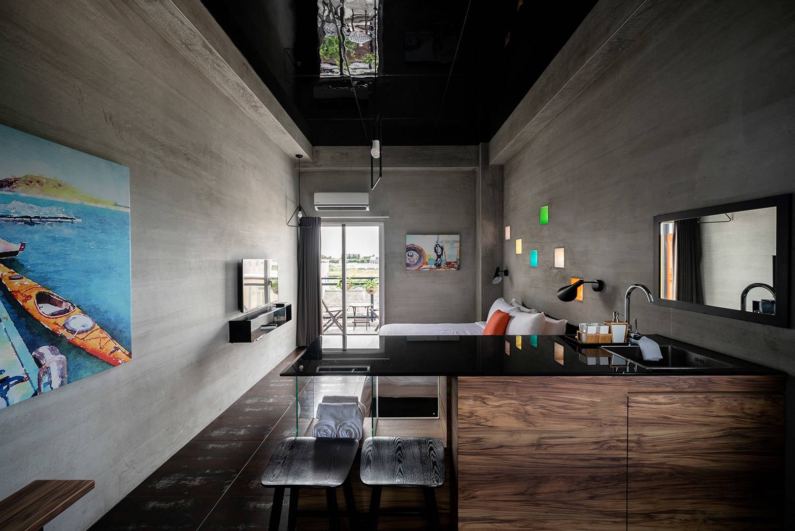白色且富有幾何設計感的外觀,在裡面點綴的是彩色的溫暖水泥工業風,還有我們真摯的服務及旅客滿意的笑容。